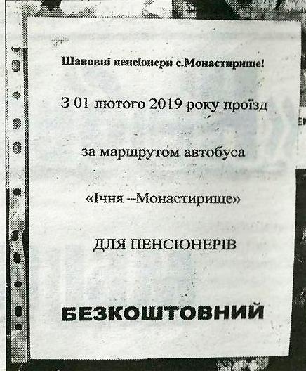 Такое объявление появилось на днях в Монастырище Ичнянского района. Сейчас во что-то бесплатное, пусть и гарантированное государством, совсем не верится. Действительно, согласно постановлению Кабинета министров Украины от 17.05.1993 №354, пенсионеры по возрасту имеют право на бесплатный проезд в городском пассажирском транспорте общего пользования (кроме метрополитена и такси) и на пригородных маршрутах. Однако частные перевозчики не всегда это выполняют. Потому что, мол, не получают компенсацию за перевозку льготников. Хотя тем же постановлением Минфина поручено ежегодно предусматривать расходы на бесплатный проезд пенсионеров, но в госбюджете на 2019-й, как и в 2018-м, средств на это не заложили, обязав местные власти финансировать поездки пенсионеров из местных бюджетов.