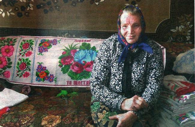 — Еге, а хазяйство на кого? Свині, птиця. Діти сварять: «Нащо хазяйство, нащо городи?» А я без діла не можу. Вік дояркою пропрацювала, маю орден «Трудової слави» 3-го ступеня. За нього 500 гривень доплата до пенсії. Сваха моя теж дояркою була. Це влітку то на городі, то на дворі пораюся, так і день минає. Звикла вставати вдосвіта. І тепер би яку годину полежати — не лежиться. Зимові вечори і ночі довгі, а що робити — вишиваю. У мене ж дві онуки ще не заміжні. Для них стараюся. — Бабуся Катя несе два здоровенні вузли вишиванок. А там і скатертини, і рушники, і наволочки, і серветки. Деякі з мереживом, яскраві. Господиня з любов’ю розкладає їх на дивані: — Оце великий рушник на щастя, на долю. Які руки зв’язувати, які під ноги стелити. Он родичам подарувала на весілля. Чернігівське телебачення знімало кілька пар. Так на наших найдовше зупинялися. Кілька разів камера крупним планом рушники знімала, я свої по телевізору впізнала. Дочка каже: «Мамо, які подушки, які наволочки? Зараз не ті часи». А я вишиваю, це ж ручна робота, краса. Згодиться. То колись нитки муліне були, іноді линяли. А тепер шерстяні, довговічні. Мені не важко. Все дітям, онукам, правнукам лишиться. Мене будуть згадувати.