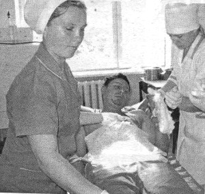 Далі — перев'язка лівої понівеченої руки. Помалу знімають бинти, потім лангету. Шита-перешита рука.