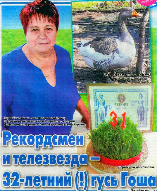 Какие только газеты и телеканалы не рассказывали о Гоше! А прошлой осенью он даже попал на телепередачу «Цієї миті рік по тому» канала СТБ. Во время съемок Тимошикам предложили подать Гошу на регистрацию рекорда. Они ходили по соседям, собирали свидетельства, сколько гусь у них живет. Приглашенная специалист-орнитолог подтвердила (по клюву и лапам): Гоше, как и утверждают хозяева, 31 год. И наконец к семье с необычным домашним любимцем приехала руководитель Украинского реестра рекордов Лана Ветрова с новостью, что Гоша официально признан самым старшим гусем в Украине.
