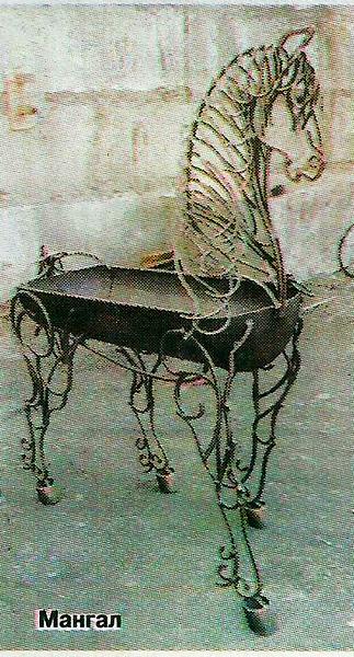 — Для этого нужно было не так уж и много - горн (печь. — Авт.), кувалда и наковальня. Горн я смастерил сам, а кувалду и наковальню купил как металлолом и подстроил под себя. Делать завитки я научился еще в Корю-ковской кузне, а вот все остальное освоил с нуля. Смотрел, что и как, в Интернете. Сначала выковал цветок. На него ушло примерно 3 дня. Еще два на то, чтобы его про-грунтовать и покрасить. А потом приловчился, стал различные подставки для цветов делать, туфли, узорные калитки и даже мангалы. Во дворе поставил дельфина, которого мы зимой гирляндами украшаем, а у калитки — оленя. Мангалы, кстати, тоже в виде животных делаю. Например, есть лошадь (смотрите на фото. — Авт,). Словом, за 5 лет руку изрядно набил.