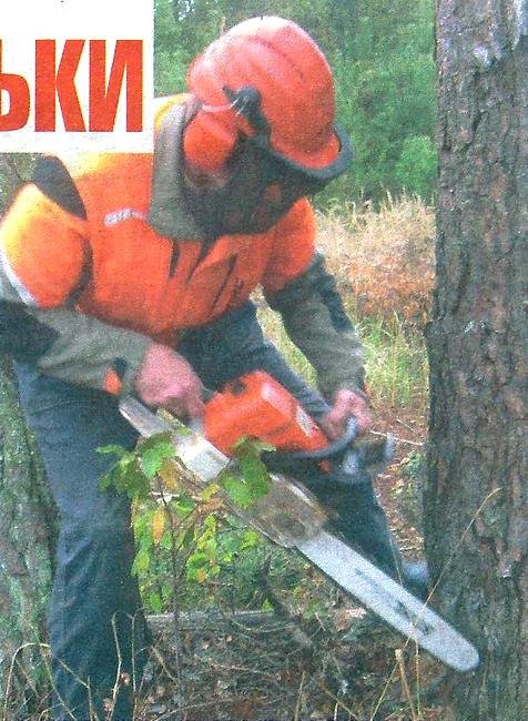 Щоб з бородою, сокирою та в чоботях, високого зросту — такими лісорубів зображали в книжках. З очікуваного — тільки чоботи і зріст під два метри. Замість бороди — вуса. (! жодного бородатого лісоруба там не побачила). У формі з яскраво-оранжевими вставками. Насправді, головне для звальщика лісу — каска, навушники, окуляри. Працює бензопилою «Штіль».