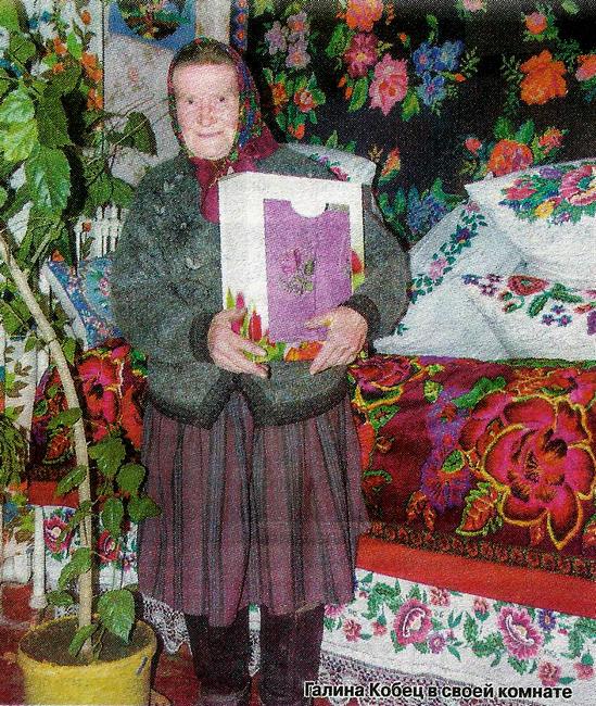 — В школе я училась слабо, больше получалось руками работать, вот и увлеклась вышивкой. Когда окончила школу, соседка, которая вышивала на заказ, дала и мне салфетку, посмотрела на готовую работу и одобрила. В следующий раз принесла мужскую рубашку - и тут у меня все получилось. С тех пор я начала на вышивке зарабатывать — брала заказы. Вышивала в свободное от работы время. А работала тяжело. В 17 лет оказалась на ферме. Три года там отработала, а потом меня перевели в звеньевые. На поле, правда, было не легче, чем на ферме, тем более что я была в передовом звене. Правда, и на доске почета мое фото висело, и на различные совещания и собрания я ездила, и подарки получала, й благодарности со значками как передовик, а в 1963 году — даже бронзовую медаль. Может, и до ордена доработалась бы, если бы муж не был против такой активности — уж очень ревновал меня, — смеется Галина Федосе-евна. — С Иваном мы вместе работали. Хотя познакомились не на работе. Жил он недалеко от меня, но гулять ходил в другую часть села. А как-то в выходной пошли мы с подружкой в клуб. Возвращаемся, глядь — за нами какой-то парень. А я же знала, что ему еще через ров идти, чуть дальше, чем мне, испугалась, что останусь с ним один на один — подружке уже поворачивать в свою сторону надо было. Недолго думая, поворачиваю и я с ней, а тот парень подходит ко мне, хватает за пуговицу на кофте и говорит: «Не бойся! Я мимо пройду и пойду домой». Подруга ушла, я же лечу к дому, запыхалась, а парень спокойно сзади идет. Дошел до моего двора: «Спокойной ночи!» И все. В другой раз снова идет за нами. Я опять бегу, залетела в калитку, слышу: «Спокойной ночи!» — и тишина. В следующий раз домой я шла радостная — за спиной никого не было. Дохожу до двора, а он стоит под калиткой. С конфетами. С тех пор мы были вместе. Я и из армии 3,5 года его ждала. Кстати, сначала муж был страшным противником моего любимого занятия — вышивки. Увидит меня с мулине и кричит: «Лучше пуговицу к фуфайке пришила бы». Я от него пряталась. Вышиваю, а как слышу, что Ваня с работы идет, бросаю ту вышивку и сажусь за швейную машину шить какой-нибудь фартук. Но однажды случился казус... Начала я вышивать свой первый ковер и так увлеклась, что не слышала, как муж в дом вошел. Смык — а ковер к юбке пришит, и отпарывать его надо не одну минуту. Скрючилась, иду навстречу Ване, тяну тот ковер за собой, а он здоровенный, тяжелый. Муж как увидел это зрелище, расхохотался и после того ругаться за вышивку перестал, даже нитки мотать помогал.