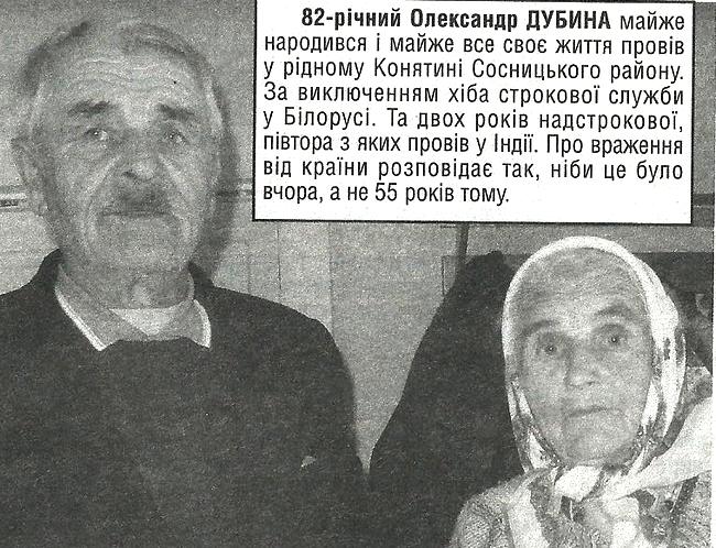 82-річний Олександр Дубина майже народився і майже все своє життя провів у рідному Конятині Сосницького району. За виключенням хіба строкової служби у Білорусі. Та двох років надстрокової, півтора з яких провів у Індії. Про враження від країни розповідає так, ніби це було вчора, а не 55 років тому.