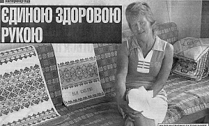— Гарно було, — каже вона. — Там Густинський монастир недалеко, природа красива. Людей зібралося чимало. Підходили й до мене, хвалили мої dишивки. А взагалі я ніде не виставляюсь. Хоча треба б було щось продати. Тільки кому і де?
