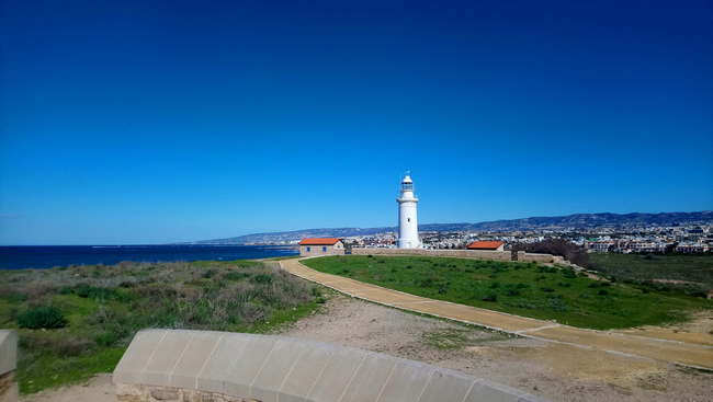Наступна визначна пам’ятка – напівкруглий римський театр Одеон, побудований в еллінську епоху. Це найромантичніше місце Археологічного парку, яке варто оглянути. Влітку тут проходять музичні концерти та вистави. Якщо піднятися його світлими щаблями, то можна побачити безмежні простори Середземного моря і величний маяк – наймолодшу будову на цій території. Його звели англійці у ХІХ столітті. Це один з п’яти маяків Кіпру, але найвідоміший з них. Він і нині продовжує виконувати свої функції, спалахуючи в вечірній час з інтервалом у 20 секунд.