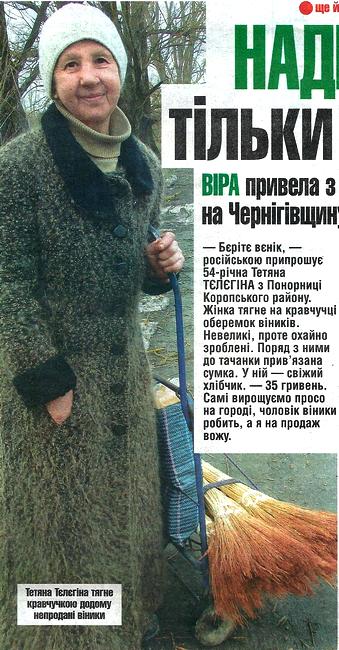 — Бєрітє вєнік, — російською припрошує 54-річна Тетяна Тєлєгіна з Понорниці Коропського району. Жінка тягне на кравчучці оберемок віників. Невеликі, проте охайно зроблені. Поряд з ними до тачанки прив’язана сумка. У ній — свіжий хлібчик. — 35 гривень. Самі вирощуємо просо на городі, чоловік віники робить, а я на продаж вожу.