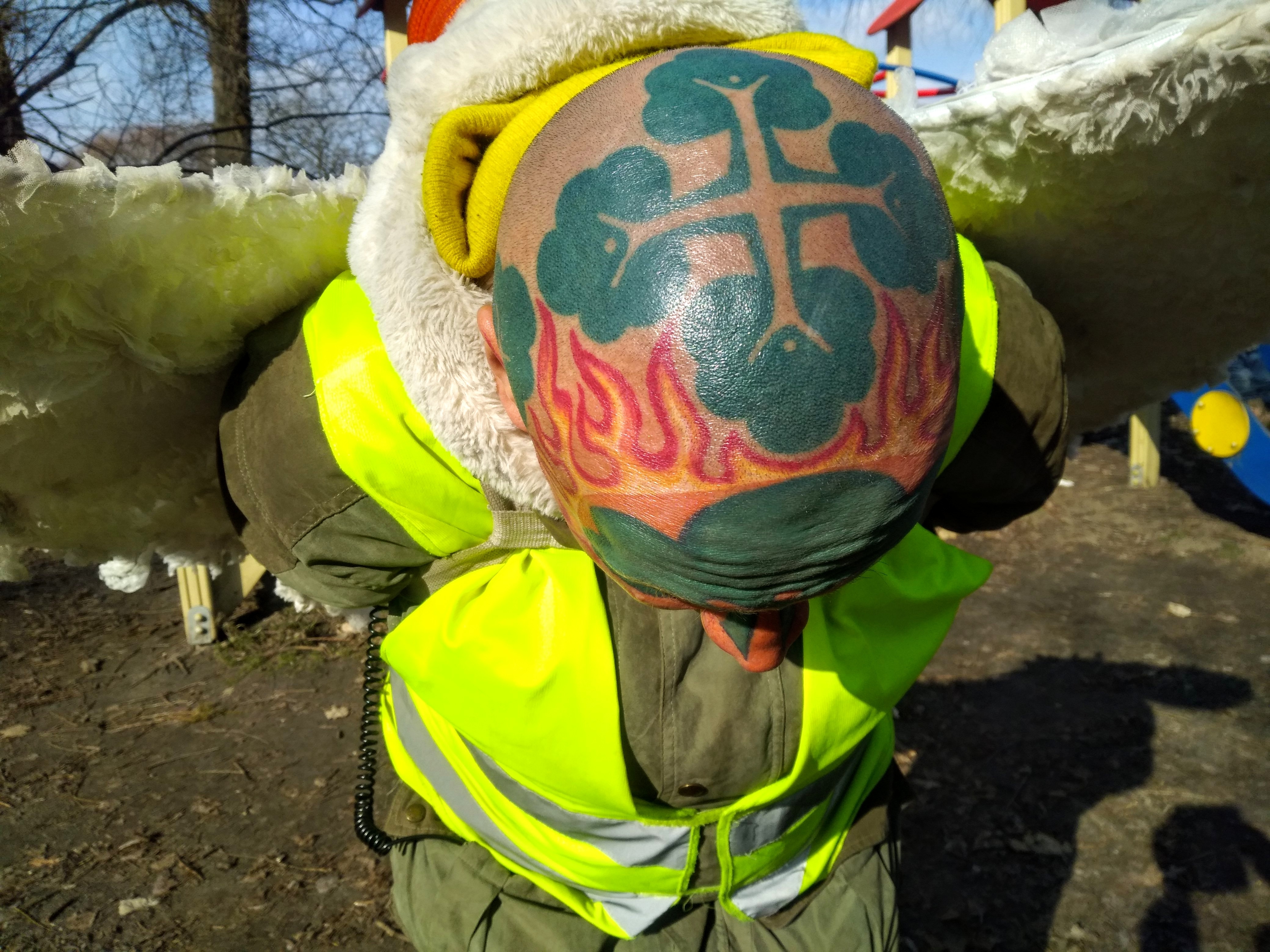 Древархъ Черниговский нагнул свою голову и предоставил возможность пощупать свой родничок на затылке и посмотреть татуировки. Сказал, что было больно, когда их делали, но он страдал за идею. Оказалось, что в них отражена гармония четырех природных стихий - огня, земли, воздуха и воды.