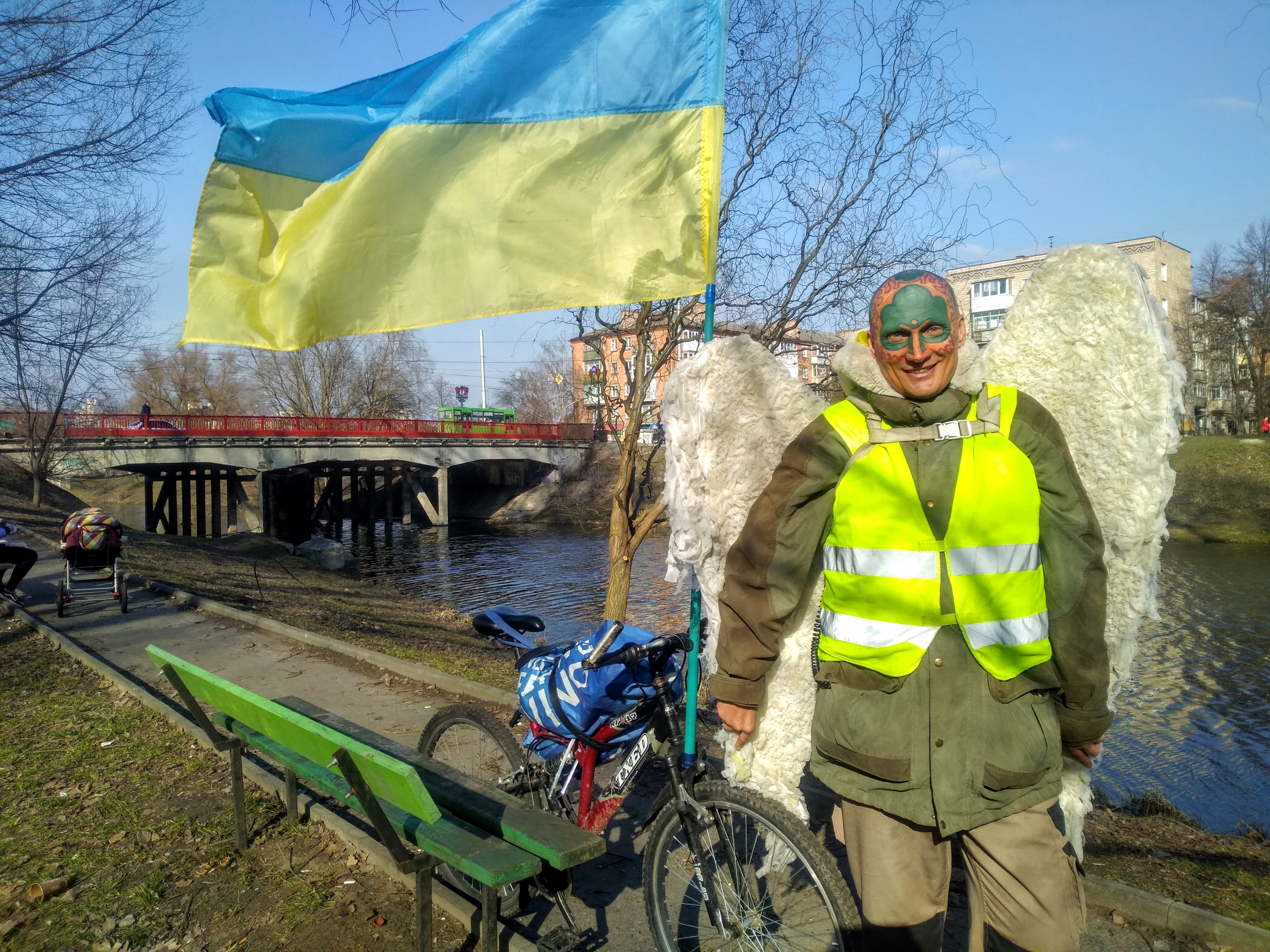 Он колесит на “древархосипеде” под знаменем украинского посада по городу, мигалка освещает ему путь, любит посещать баню, заговаривает с людьми, почти все отвечают ему улыбками и вступают в разговор. Все сразу понимают, что он шутит, разыгрывает, балагурит, и пытаются среди обычных или шутливых его слов уловить подтекст. Не всем это удается.