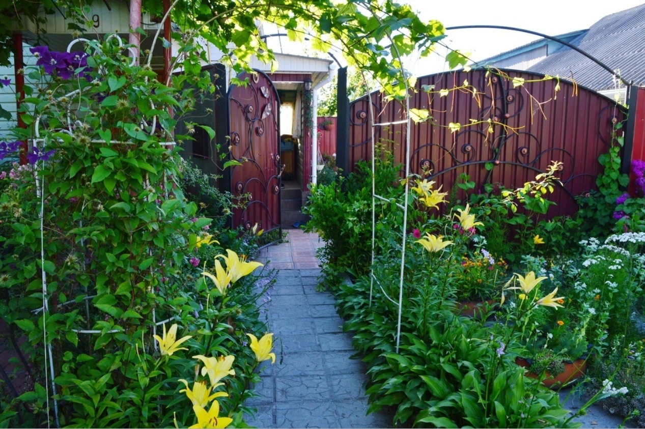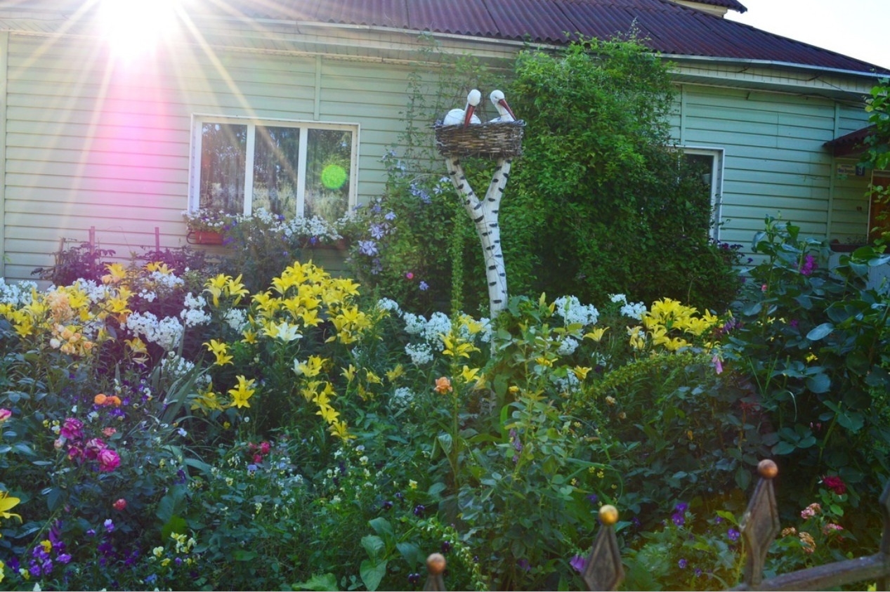 З ранньої весни й до пізньої осені подвір’я Галини та Андрія потопає у квітах! Квіти давно покинули межі двору і «пішли» на вулицю, заплітаючи бесідку, тин, дерев’яні діжі, декоративний колодязь, створені майстровитими руками господаря.