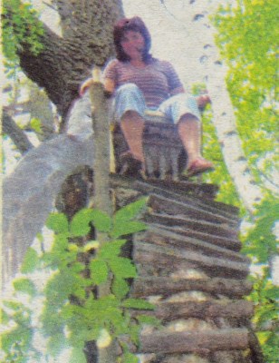 — Хочете посидіти? Піднімаю голову. На висоті десяти метрів — крісло. Дістатися до нього можна по дерев'яному трапу, що на похилій березі. Хотіла всістися у те крісло, полізла. До сидячки лишилося метрів два. І треба ж було мені глянути вниз. В голові запаморочилося, ноги задрижали... Пішла вниз. За моїм боягузством спостерігало кілька людей. То сусіди по дачі Андрія Пилиповича зійшлися подивитися. Одна з них, чернігівська підприємниця Неля Новрузова сміливо полізла і всілась у крісло.