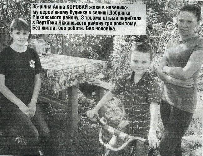 35-річна Аліна Коровай живе в невеликому дерев’яному будинку в селищі Добрянка Ріпкинського району. З трьома дітьми переїхала з Вертіївки Ніжинського району три роки тому. Без житла, без роботи. Без чоловіка.
