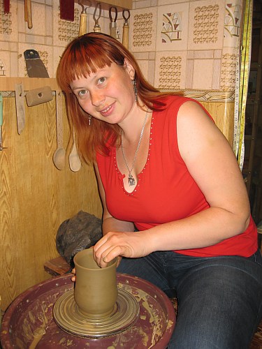 А вот Иру я застала за гончарным кругом. В ее умелых руках буквально на глазах формировались округлые горшочки. На данный момент в мастерской два гончарных круга, один предназначен для детских занятий, а второй − более профессиональный. Оба круга − ножные, так как электрические мастера специально не брали. Среди гончаров считается так: чтобы научиться «чувствовать» глину, учиться надо именно на ножном круге, потому что вибрация от мотора этому сильно мешает. Зато если научился гончарить на традиционном круге, достаточно легко перейти на электрический, но не наоборот.