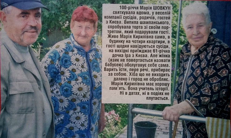 100-річчя Марія Шовкун святкувала вдома, у веселій компанії сусідів, родичів, гостей з Києва. Випила шампанського, спробувала торта зі своїм портретом, який подарували гості. Живе Марія Кирилівна сама, в будинку на чотири квартири, в гості щодня навідуються сусіди, на вихідні приїжджає 61-річна дочка Іра з Києва. Але жінка (язик не повертається назвати бабусею) обслуговує себе сама. Варить їсти, пере речі, прибирає за собою. Хіба що не виходить далеко і город не обробляє. Марія Кирилівна має хорошу пам’ять. Вона учитель історії. Ні в датах, ні в подіях не плутається.