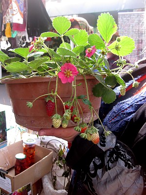 Повнимательнее рассмотрев прилавок, я увидела еще много всего интересного: например, клубнику в горшочке. Удивительно, но с веточек свисали самые настоящие ягоды, а из-под листочков выглядывали розовые цветки!