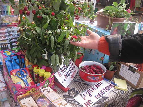 Букет из малиновых веточек, краснеющих ягодами, на одном из прилавков Центрального рынка наверняка привлекает внимание многих прохожих. Во-первых, осенью – и вдруг… малина – уже не совсем обычно! А во-вторых, если присмотреться, веточки-то совсем разные: на одной висят по обыкновению малиновые «шапочки», а на другой – такие себе красные «ежики», больше похожи на маленькие клубнички, а внизу – подпись: «КЛУБНИКА-МАЛИНА». Интересно? Вот и мне захотелось узнать: что, откуда, а заодно – и почем?