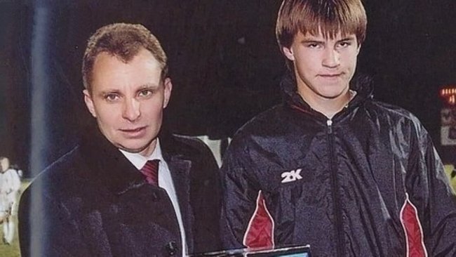 Микола: він «лівоногий», зовсім маленьким ще був. Пам’ятаю, що у нас був волейбольний м’яч (не футбольний, а волейбольний), а самої камери у м’ячі не було. То я ганчір’я туди напхав. І пішли. А він такий важкий був, цей м’яч. Я стою на воротах, качаю йому цей м’яч, а він лівою ногою все б’є. А тут саме були тренування. Тренер побачив, що він лівоногий і каже: «А ви десь займаєтесь?», кажу, що ні, не займаємось, збираємось тільки до школи йти. «А в яку школу?» - питає. «У третю!», - кажу. Він там у блокнотик собі записав, помітку зробив. Пішов до школи він (Андрій, - ред..), і вже, на замітку, звідти знали про нього і забрали сюди. От з семи років, можна сказати, що він у цій школі виріс, тренувався.