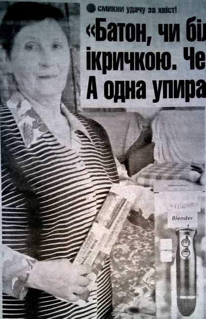 «Вісник Ч» Раїса Михайлівна виписує давно, каже, що газету любить. Читає від початку і до кінця. Сама велика любителька посміятися, і «Вісник» полюбила за таку ж веселу вдачу, а особливо за незмінну сторінку гумору. Не раз посилала квитанції на акцію «Смикни удачу за хвіст», а спіймала удачу від «Вісника» вперше. Раїса Никифоренко стала першим переможцем тижня і виграла блендер у подарунок від улюбленої газети.
