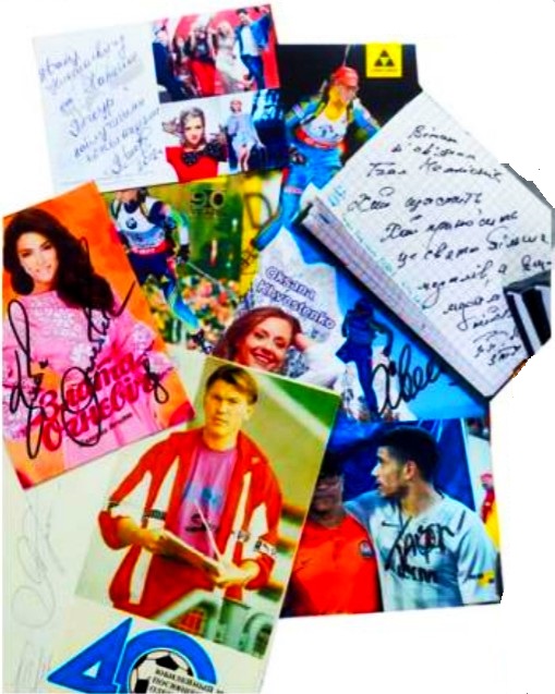 Переважно брав автографи пан Калита у відомих артистів. А ще у спортсменів: важкоатлетів, футболістів, біатлоністів, стронгменів Василя Вірастюка, Олександра Пеканова, тощо. Автографів гравців київського «Динамо» всіх часів, мабуть, найбільше.