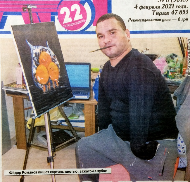 34 минуты 59 секунд понадобилось 31-летнему Федору Романову из Дослидного (Носовщина), чтобы написать картину кистью, зажатой в зубах, -и стать рекордсменом Украины! Его достижения зафиксировала руководитель Национального реестра рекордов Украины Пана Ветрова во время съемок одного из выпусков ток-шоу «Касается каждого» на телеканале «Интер», Ведущий Андрей Данилевич назвал Федора «человеком с сильным характером и невероятной любовью к жизни», а волонтер Лина Дешвар сравнила его с Ником Вуйчичем (всемирно известный оратор, актер, меценат и писатель, который из-за редкой генетической болезни родился без рук и ног).