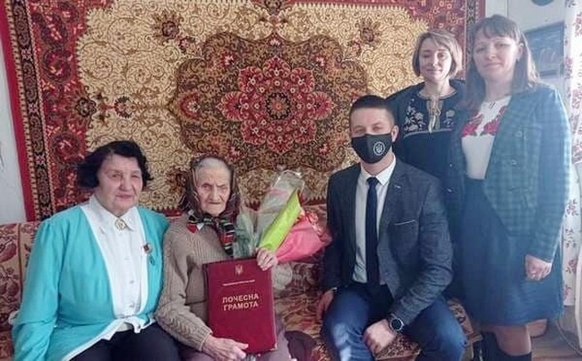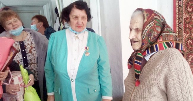 Приїхали на ювілей до бабусі голова Корюківської райдержадміністрації Володимир Полубень, голова організації ветеранів України Менської ОТГ, почесний ветеран України Раїса Москальська. Вони передали ювілярці почесну грамоту обласної ради та ради Чернігівської обласної організації ветеранів України. А ще – букет яскравих квітів, подарунки.