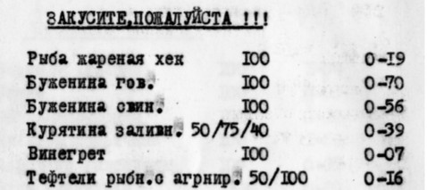 Фрагмент меню ресторану «Ревна», 1970 рік