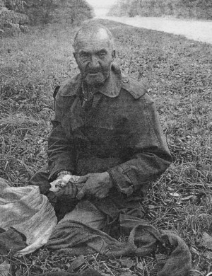 З Олександром Авраменком вперше ми зустрілися в жовтні минулого року, коли їхали у відрядження до Морівська Козелецького району. На узбіччі асфальтованого «битого шляху» десь між Якубівкою та Козерогами він і сидів, обв'язавши голову від холоду довгим синім шарфом і щось перебираючи у своїй напівпорожній торбі. Зупинилися, підійшли. Може, чимось допомогти треба? Побачивши незнайомців, чоловік непевного віку у сірому вбогому плащі квапливо почав збирати своє нехитре майно, полохливо наводячи оком у наш бік. На привітання відповів, проте на розмову явно не був налаштований. Та й особливого хисту до балачок не мав, що стало зрозуміло з перших же його слів. Таких в медицині делікатно називають «розумово неповноцінними». Але що такій, з усього видно, беззахисній людині робити за десяток кілометрів від найближчої домівки? З малорозбірливих відповідей все ж таки з'ясувалося, що звати чоловіка Сашко Авраменко, що живе він із сестрою в Мажугівці Чернігівського району, а це вже не вперше ходив до Смолина здавати порожні пляшки. Від пропозиції підвезти його додому відмовився, хоча запропоновані гроші й взяв, акуратно зав'язавши їх у вузлик. А ще попросив подарувати йому чоботи. І, несподівано підвівши риску під «інтерв'ю» вочевидь завченою фразою «Дядьку, відпустіть, я піду», повернувся до нас спиною і побрів своєю дорогою, важко опираючись на палицю.
