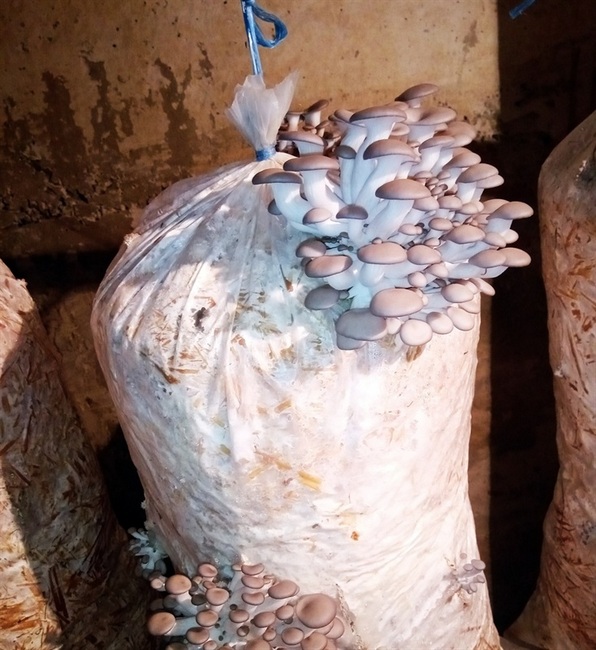 – Після цього мішки (блоки) підвішували на стелажі, які чоловік зробив, у сарайчику. В приміщенні має підтримуватися відповідна температура. Для трьох періодів від проростання міцелію до збирання – різна температура. Спочатку це 22–27 градусів (два-три тижні), найдовший період – 30–35 днів, поки розростається міцелій. Температура повинна триматися на рівні 22–24 градусів, вологість повітря – 60–65 відсотків, – ділиться досвідом Ярослава.