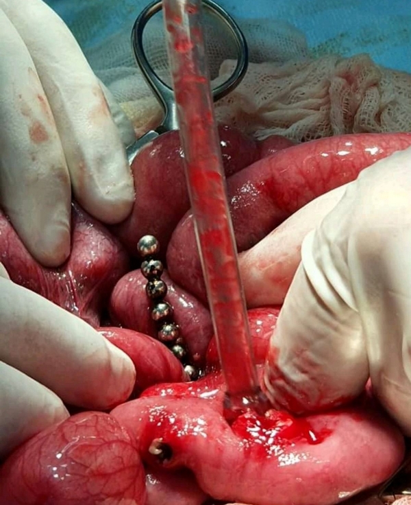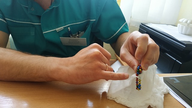 - Так, дітки чого тільки не ковтають! Це різні кульки, магніти, горіхи, стрижні та інше. Ось наприклад, магнітні кульки, які перетворилися в ланцюжок. Біда не в тому, що дитина проковтнула декілька маленьких кульок, а в тому, що магніти в різних відділах кишечника продовжують притягуватись один до одного, створюючи ланцюжок. І таким чином викликають пролежень в стінці кишечника аж до перфорації. Звісно, в такому випадку потрібно оперувати, бо у дитини виникає перитоніт.