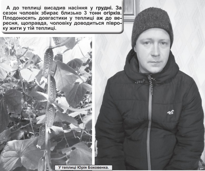 Перший урожай огірків сосничанин Юрій Боковенко зібрав 23 лютого. А до теплиці висадив насіння у грудні. За сезон чоловік збирає близько 3 тонн огірків. Плодоносять довгастики у теплиці аж до вересня, щоправда, чоловіку доводиться півроку жити у тій теплиці.