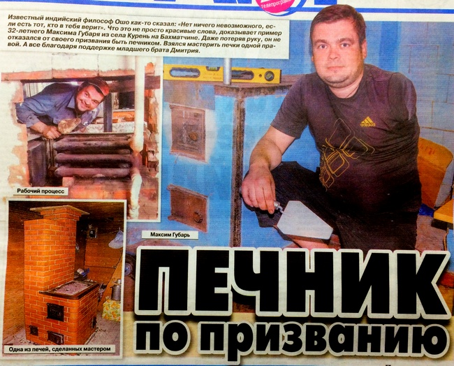 Известный индийский философ Ошо как-то сказал: «Нет ничего невозможного, ли есть тот, кто в тебя верит». Что это не просто красивые слова, доказывает пр 32-летнего Максима Губаря из села Курень на Бахматчине. Даже потеряв руку, отказался от своего призвания быть печником. Взялся мастерить печки одной г вой. А все благодаря поддержке младшего брата Дмитрия.