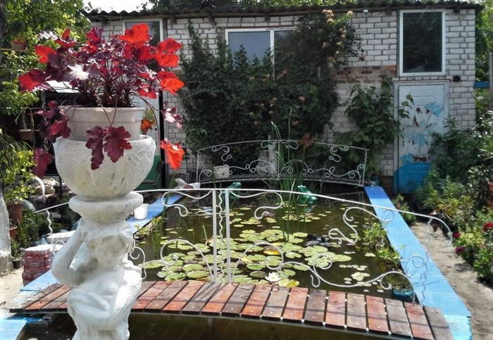 Сыновья с детства помогали маме в саду, вскапывали и поливали, строили цветочные композиции, лесенки и горки, соорудили даже бассейн для рыбок – в нем и сейчас плавают декоративные караси и растут небывалой красоты нимфеи. Осенью из лозы смастерили воз и разместили на нем декоративные тыквы разной формы и цвета, что стало чудесным дополнением к садовому ландшафту.