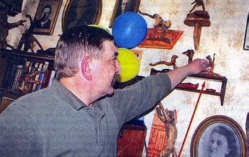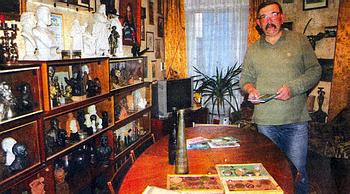 В маленькой гостиной (да, действительно, эту небольшую комнатку так и хочется назвать этим старинным словом) царит какой-то покой, кажется, что здесь властвует другой отсчет времени. Может быть, это связано с охристо-коричневой гаммой картин, а может быть, этот колорит придает огромный стол -свидетель всех семейных праздников и юбилеев. Его приобрели родители Калерии Ивановны еще до ее рождения. Сейчас Калерии Ивановне, маме Владимира, уже - 83 года. Возможно, причина в иконе середины XIX века кисти какого-то сельского богомаза, подаренной друзьями Владимиру, тогда еще начинающему историку. Может быть, это ощущение придает строгая грузинская керамика, которую несколько лет собирали Владимир и его жена Татьяна. Своеобразие и нестандартность убранству гостиной придает и обширная коллекция бюстов знаменитых исторических личностей.