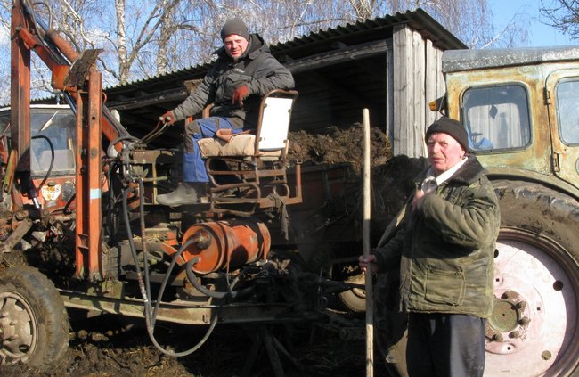 Господар Олексій Петрович та син Анатолій Олексійович вантажать перегній