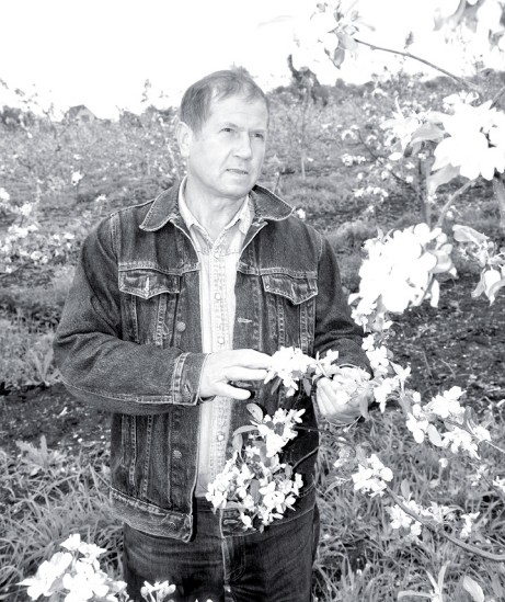Між цими двома знімками, зробленими у яблуневому саду Володимира Дикого, календарна відстань усього в кілька місяців. Тоді, навесні, ми просто не могли проїхати повз, не помилувавшись вкритими білопінним цвітом рядами, пообіцявши восени повернутися, щоб побачити результати того цвітіння самим і розповісти нашим читачам, які ж вони на смак — ці пізні яблука молодого саду відставного правника...