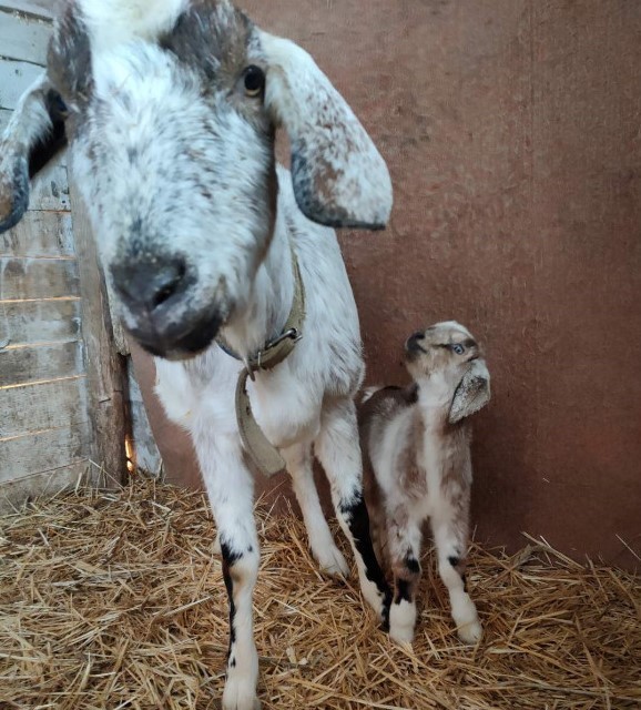 На фото выше - взрослые дойные козы – мама Стеша, ей 4,5 года и 3-летняя дочка Муся. Эти козы на 68,5% англо-нубийской молочной породы, причем, по сравнению с обычными козами, ее молоко имеет ярко выраженный сливочный вкус, похоже на разбавленные сливки. А за счет того, что в молоке большое содержание жира и белка, выход сырной продукции получается больше. После первого покрытия (родов), Стеша давала 2,5 л молока в день, после 2-х родов – 3-3,5 л, и сейчас, после 3-х дает 4-4,5 л. Количество надоя зависит о многих факторов (от корма, от физического состояния и др.) Есть козы которые останавливаются на 3 литрах, а есть которые дают и 5 литров молока. Дойные козы стоят от 5 000 грн.