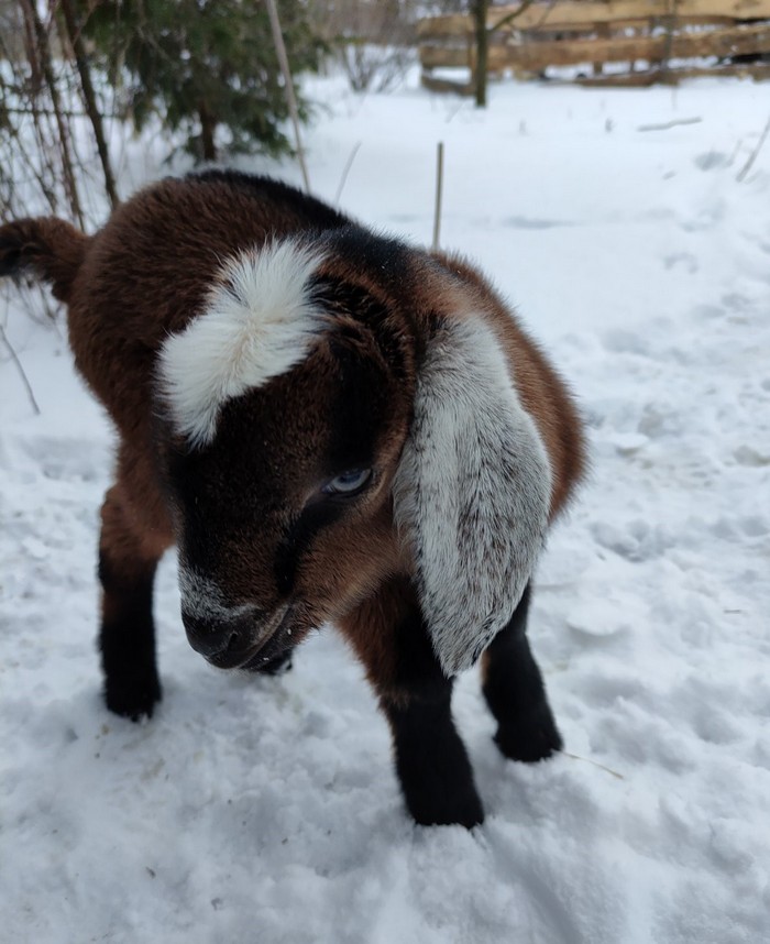 Козочка молочной породы Аляска, ей 1 месяц. Это смесь двух пород: на 25% англо-нубийской (британская порода) и на 75% породы ламанча (американская). Таких козочек можно продать за 3000-4000 грн. Все были проданы.