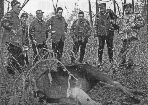 Клієнти (праворуч) з єгерями ТОВ "Єлінський ліс" після вдалого полювання на лося (знімок минулих років; нині полювання на лося не ведеться)
