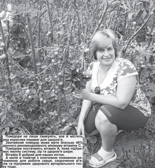 Зі свого досвіду жінка розповідає, що тільки висадила городину, всю поливає настояним курячим послідом. Потім поливає розведеними сухими дріжджами. Потім кожні 10 днів бризкає і поливає під корінь сироваткою, розведеною водою. Цього року багато господарів бідкаються, що чорніють помідори, дощі часті цьому сприяють. У Ніни Володимирівни вони не почорніли, але з’явилась чорнота на листі. Тому все обрізала, а помідори достигають. Ще пробує господиня обприскувати помідори рідким дігтярним милом. З таким доглядом з невеличкої грядки помідорів збирають такий урожай, що вистачає і продати, і родичам вислати поштою (хоч там і не дозволяють такого робити). Помідори жінка висіває маленьких сортів, щоб накладати літрові банки. Насіння сама ніколи не збирає, купує у колеги. Перець висаджує на підвіконні, а помідори відразу у теплицю, тоді вони міцніші. Уже закрила чимало помідорів, та ще стільки ж висить на стеблах. Закриває із базиліком, із морквяним бадиллям, половинки із петрушкою, варить кетчупи - дуже любить помідори. Та найбільше їй смакують свіжі з миргородським салом. Його родичі привозять чи висилають поштою. У нього навіть шкірочка ніжніша і ніби запечена, коричнева, ароматна, бо поросятко смалиться різними травами.
