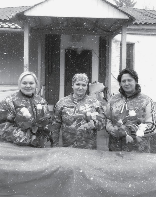 У жіноче свято навіть під час війни без квітів від побратимів - ніяк; з історії волонтерських буднів волонтерського екіпажу «Захисник; на рубежі біля Рубіжного; Тетяна ЗЕЗЮЛЬКІНА та Людмила КРАВЧЕНКО з волонтером, воїном та капеланом ЗСУ Людмилою АЙСІН (ТЕРЕЗОЮ).