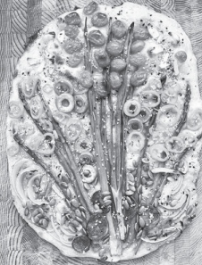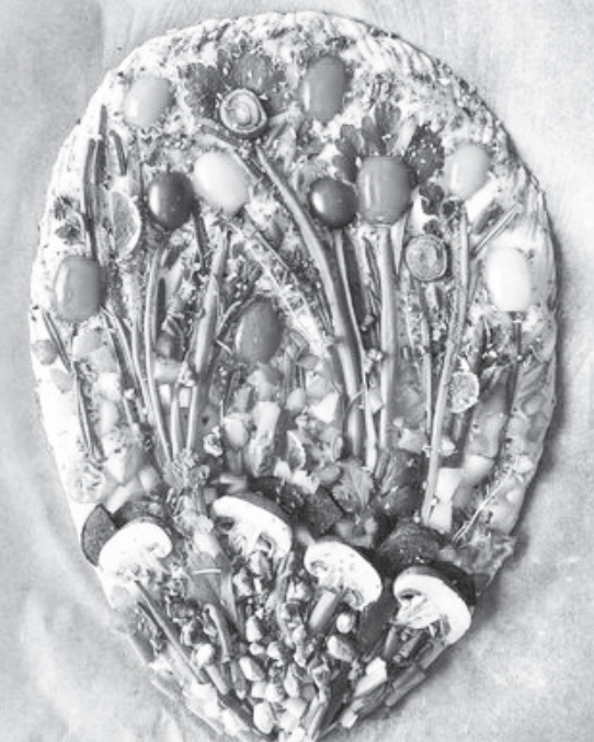 Ії творча натура помітна на пирогах відразу. Жоден не схожий на інший. Якщо на одному шедеврі помідори перетворились на маки, то наступного разу вони стануть чудодійними вітами. Є на пирогах гриби, перець солодкий, петрушка, цибуля, огірки і різні спеції. Зі шматочків овочів жінка складає цілі картини. Для того, щоб і взимку «малювати» їстівні шедеври, заморожує овочі заздалегідь. Помідори ріже кружальцями, щоб потім відразу покласти їх на пиріг. Так він збереже форму, адже перемерзлий помідор не поріжеш. Так само кладе і цвітну капусту вже відварену, щоб відразу прикрасити. Зверху пироги притрушує спеціями. Наприклад, білий кунжут ніби завершує картину і робить її ну, дуже красивою. Насіння льону теж використовує.
