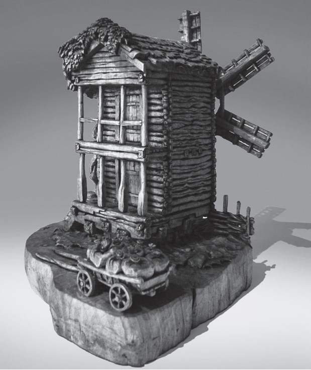 Серед його вже створених робіт - майже триметрова скульптура козака-характерника у жупані із шаблею, фігури різних екзотичних тварин. Всі вони - прекрасні, але найбільше за все мене вразили невеличкі - 35 на 35 сантиметрів - скульптурні, об’ємно-просторові композиції - мініатюри. Чоловік з жінкою перебирають картоплю, дід з бабою вибивають соняхи, чоловік оре поле. Старовинний вітряний млин, як одна з тих милих серцю прикмет минулого. Вітряків нині вже не побачиш, хіба що в Національному музеї народної архітектури та побуту під відкритим небом у селі Пирогове.