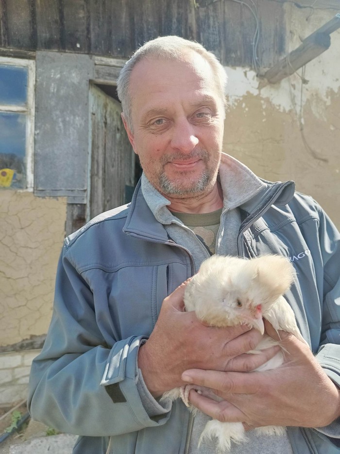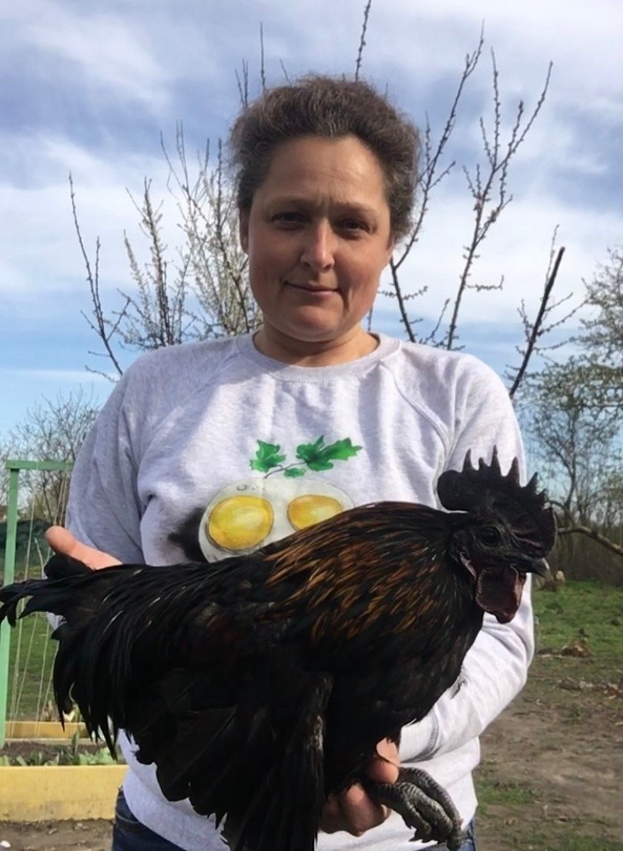 Якось лазила в інтернеті і побачила курей ухеілюй. Це м’ясо-яєчна порода з Китаю, з чорним м’ясом, кольором шкіри та зеленою шкаралупою яєць. Нутрощі і кістки теж чорні. Занесена навіть у «Червону книгу» в Китаї. Зацікавилася. М’ясо та яйця дієтичні, щось на зразок перепелиних. Рекомендують дітям, людям, які хворіють, після операцій. На смак, як молода яловичина. Знайшла оголошення про продаж інкубаційних яєць. Перед війною вони коштували 50 гривень за штуку. На початку лютого купили 60 штук, заклали в інкубатор. Через 19 днів, рівно 24 лютого, вони почали вилуплюватися. Називаємо їх діти війни. І що цікаво, вижили майже всі — близько 50!