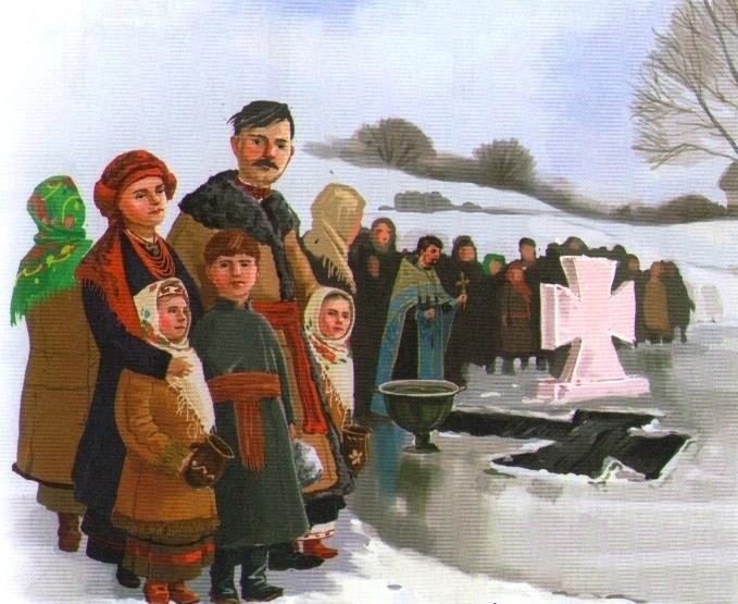 Зима 1942 року видалася прелютою. Лід на річках і ставках сягав до півметра. Було вирішено на людному місці біля мосту через Новий Потік відслужити Йордан. Поки чоловіки випилювали з льоду чималі брили та майстрували з них хрести, хлопчаки кружляли на ковзанах-деревяшках навколо них, з небаченим інтересом стежили за їх незвичною роботою. Невдовзі перед мостом звелося три крижаних хрести (посередині – великий, а по краях менші), перед хрестом зробили льодовий престол, все це обрамили візерунками, в які залили червоного квасу з буряків, що його дітлахи поприносили з домівок. Після цього споруда стала не просто красивіша, а набрала виняткової врочистості. В обідню пору 19 січня 1942 року біля Йордану розпочалося служіння. Піднесено й урочисто співала півча, два хлопчики-стихарі, брати Олексій та Микола Костюки, роздмухували кадило, підносили батюшці кропило для освячення води.