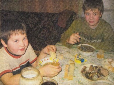 — Зараз вечеряти будемо. Чули, хлопці? — мати гукає на синів, що шаруділи у сусідній кімнаті. А сама вже дістає з печі чавунець з борщем. Потім добрий кусень печеного м'яса. З банки — солоне сало. Батько з-під ліжка вишневий компот.