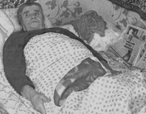 — Усе є, тільки здоров'я нема, — каже жінка. — Оце від 5 вересня я в такому стані. Субота була. Я сіла на велосипед і поїхала в магазин. Як воно так вийшло, що раптом упала. Думала, підведусь, аж не можу. Страшенно болить нога. Гукаю на поміч. Вибігла з магазину продавець, ще люди підійшли, підняли. Визвали Шуру, чоловіка. «Швидкою» відвезли в Короп. Там кажуть: перелом кістки у стегні. Та ще й із зміщенням. Півтора місяця лежала на витяжці. Спицю вставили. А як вийняли, наклали гіпс. Аж до пояса. От і лежу. Завтра син повезе в Короп. Може, знімуть гіпс. А коли вже зможу ходить, Бог його святий знає. У мене раніше дуже боліли ноги в колінах. Лікар казав, що, може, саме через це й упала з велосипеда.
