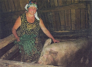 — Тепер ми так не балуємся. — говорить хазяйка. — Порубали великими шматками — хай вони заботяться. Свині, щоб вона не здуріла, щоб там станок не рвала, треба чимось заботиться. Можна камінців накидать із кирпича, з бою, — хай гризе.