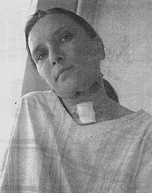 Потім, здається, я намагалась розв'язатися, мене прив'язували знову. Все було, як уві сні, нічого не пам'ятаю. В реанімації пролежала два тижні. Мені зробили кілька розрізів, видалили два зуби. Горло ще досі не зажило, там трубочка стояла. Зараз почуваю себе нормально, горло не болить, тільки трохи свистить через дірку. Зуб теж не болить, нема його.