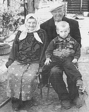 Мотря Нечипорівна і Михайло Миронович Коваленки з правнуком Максимком