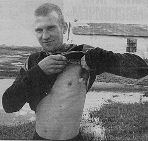 — В'ячеслава Йовсу привезли до нас о 21.15, — говорить завідувач хірургічного відділення ічнянської районної лікарні Михайло Острик. — Хворий був у тяжкому стані. Дихав важко, вигляд мав синюшний, скаржився на біль у грудній клітці зліва. Його оглянув черговий лікар-травматолог Володимир Горчинський. У хворого були три проникаючі рани грудної клітки зліва. Зробили рентген. Ліва легеня виявилася проколотою, здулась, як кулька.